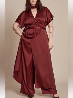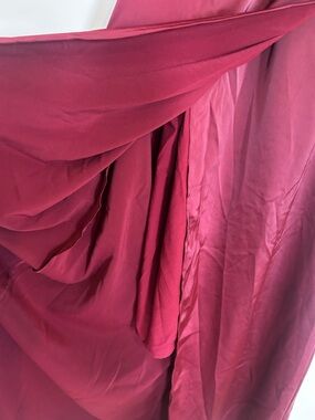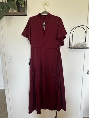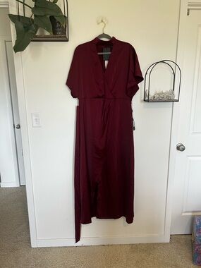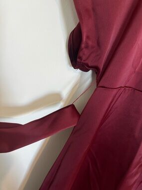 Midi or maxi length depending on your height. V cut with a collar style neckline. Matching belt. Large asymmetrical slit down front. Burgundy wine color. This is in new condition.