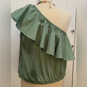 Ruffle Slanted Shoulder Top In Shady Hollow Green Sz LG NEW!