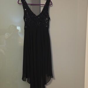 Le Chateau fully lined sheer dress with sequins on bust. Invisible zipper in the back. High Lo design. 97% polyester and 3% spandex. Excellent pre-owned condition. Only worn once.