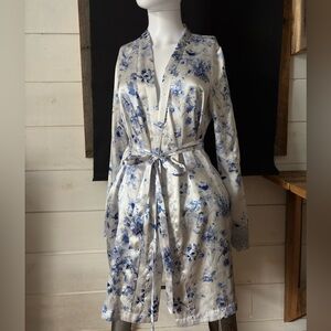 Satin robe with delicate blue floral pattern. Lightweight, silky feel. Tie waist for adjustable shape. Feminine long sleeves and open neckline. Ideal for lounging or morning routines.