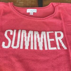 Soft coral knit sweater with a classic crew neckline. Features belle BEACH label by Kim Gravel. Lightweight textured stitch for everyday wear.