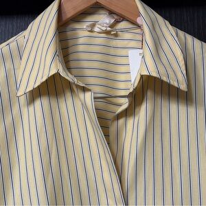 Add a touch of elegance to your wardrobe with this yellow striped button down shirt. Perfect for any occasion, it combines style and comfort effortlessly.
