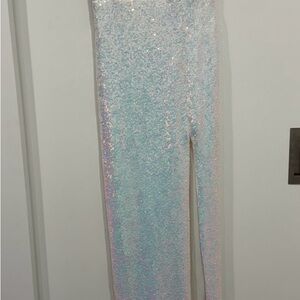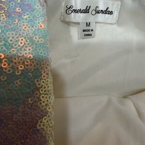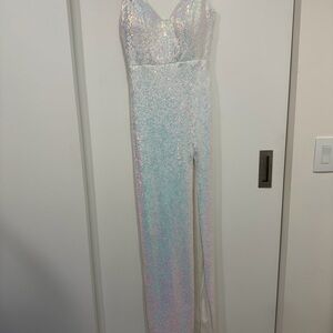 Stunning iridescent sequin dress. Features a fitted silhouette and elegant design. Perfect for special occasions.
