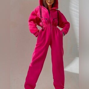 Stay cozy and stylish in this vibrant pink hooded jumpsuit. Perfect for casual outings or lounging at home.