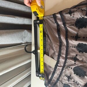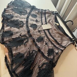 Delicate black embroidered overlay with ornate appliqué. Sheer tulle layered over a nude lining. A-line silhouette with decorative horizontal trims. Feminine and elegant for dressy occasions.