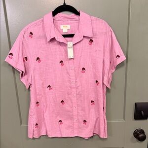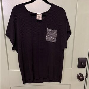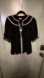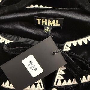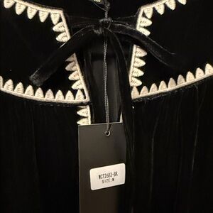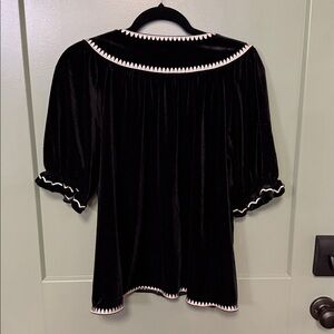 THML velvet blouse off white trim along collar, front placket, sleeves, and hem. Short puff sleeves with ruffled edges. Front tie at neckline for a delicate touch. Elegant piece for dressed-up looks.