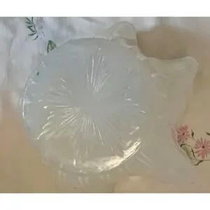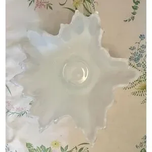 vintage glass item is a Fostoria Heirloom opalescent handkerchief bowl, likely produced between 1959 and 1970. It features a distinctive "hanky" or handkerchief edge with staggered, ruffled points. The bowl is made of opalescent glass, which has a milk-white, translucent appearance.