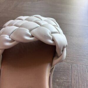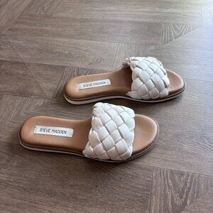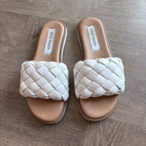Steve Madden Women's Paislee Flat Sandal. This casual slide sandal featuring a chunky, braided vamp strap features a lightly padded footbed with arch support. Synthetic upper, lining and sole. Runs small, size reflects a half size up for a comfortable fit. In excellent condition. Only worn a handful of times. One small scuff on braided slide as shown in photos.