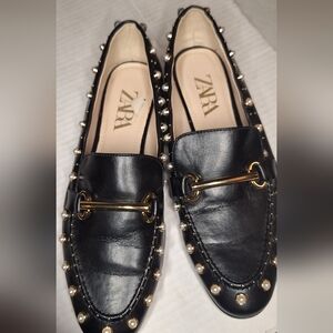 ZARA Black Leather Pearl-Trim Loafers with Gold Bit