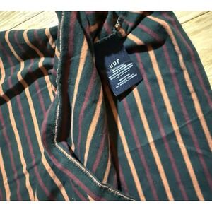 The product is a men's medium size green, orange, red striped HUF Worldwide T-shirt made of cotton with a crew neck and short sleeves. It features an embroidered logo and is machine washable. The shirt is a regular fit and was manufactured between 2020-2029. The T-shirt is a part of various themes like rock, hippie, colorful, and 80s/90s hip hop, making it a versatile and trendy choice for men looking for a stylish and comfortable clothing option.