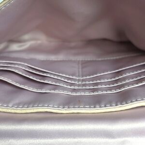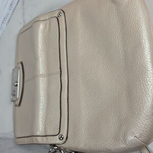 #0157 COACH brand, KRISTIN style, METALLIC CHAMPAGNE color, LEATHER FLAP CROSSBODY SMALL BAG PURSE, long strap, silver hardware, pink satin lining, excellent pre owned condition. Approximately measurements: H 6", W 9.5", D 1 ", drop handle 23", Note: small stain inside, please look the last pic.