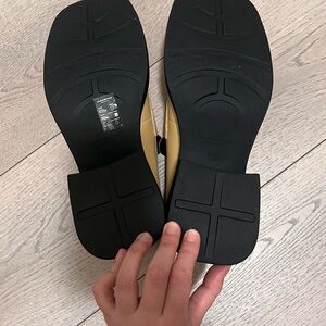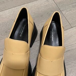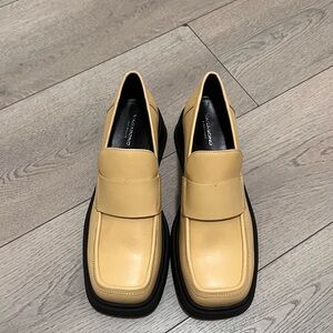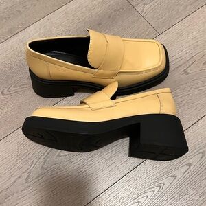 Modern chunky loafer heels from Vagabond in a soft beige/yellow tone with black platform sole. Super on-trend, minimal, and easy to style with trousers, denim, or skirts.