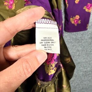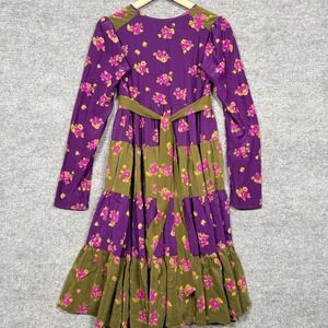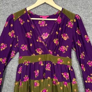 Betsey Johnson Size 6 Tiered Midi Shift Dress Purple Brown Silk Floral V-Neck Long Sleeves Boho Peasant Flowy Colorful Side Pocket USA