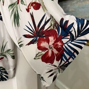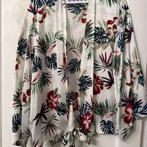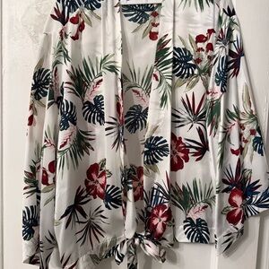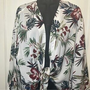 Lightweight white kimono blouse with tropical leaf and hibiscus print. Tie-front hem and relaxed fit. Vibrant red florals with green and navy foliage. Easy, breezy layering piece. Silky material