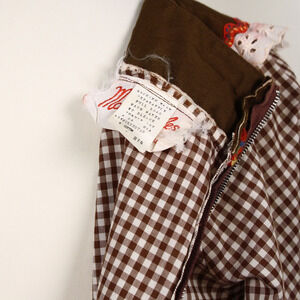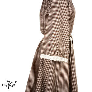 * Special Feature: Vintage prairie western style Malco Mode brown and white check dress. Neckline and circle skirt have a wide band of dark brown fabric.