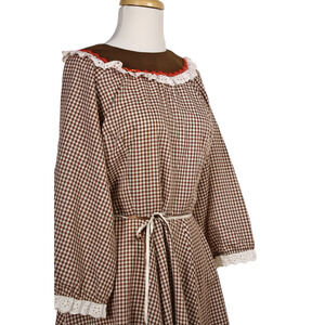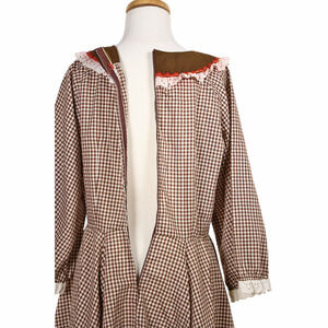 Vintage Malco Modes Prairie Dress Brown White Check Ric Rac Eyelet Trim Size 14