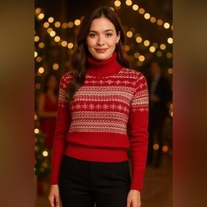 Embrace warmth and style with this elegant red Fair Isle turtleneck sweater. A perfect addition to your winter collection.
