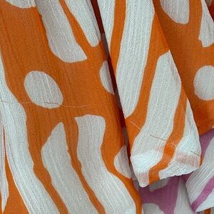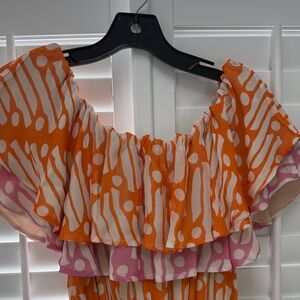 Lightweight cream maxi with playful orange and pink stripe detail. Off-shoulder ruffled neckline. Elastic waist for a flattering fit. Flowing tiered silhouette ideal for warm days. Shell: 100% Viscose, Lining: 100% polyester. Small snags in fabric as pictured.