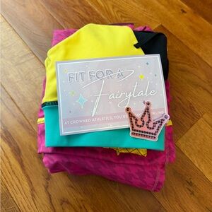 Crowned Athletics Pumpkin Queen Leggings, Sports Bra, Athletic Skort, Sash, and Head Band. The head band has been altered to add an elastic band as shown in the photos. Ironically, it hasn’t been worn. The leggings, bra, and skort are all size M. I wore it a couple of times and got some great pictures. They are in excellent condition, only worn a few times. Love the colors. Hope someone else enjoys this as much as I did.