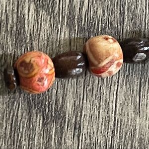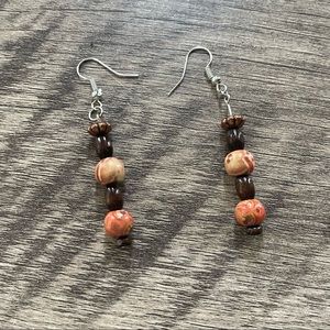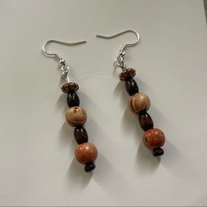 These are adorable made of petrified wood beads. They are about 2 inches down from the ear and look great with everything especially autumn clothing.