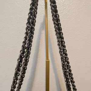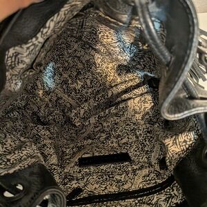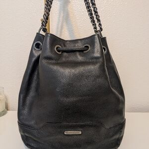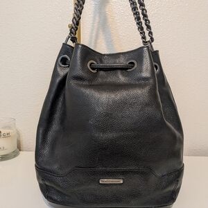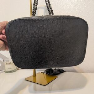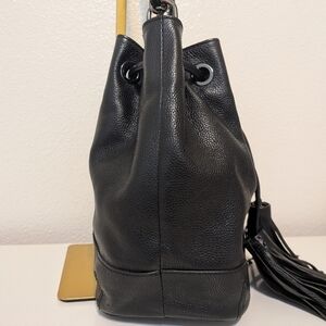 Stylish black bucket bag. Features chain strap and tassel detail. Perfect for any occasion.