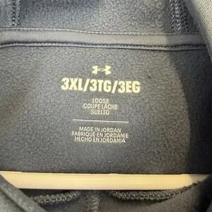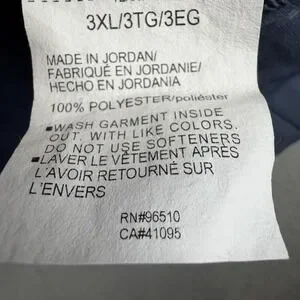 Manufacturing info: Inner neck print lists Loose fit, size 3XL/3TG/3EG, and Made in Jordan; interior care label lists 100% polyester construction, wash garment inside out with like colors, do not use softeners, RN# 96510, and CA# 41095.