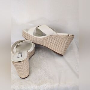Elevate your style with these Calvin Klein cream wedges, featuring a sleek slip-on design and a comfortable wedge heel. The textured woven material adds a touch of sophistication, making them perfect for both casual and semi-formal occasions. Enjoy the minimalist aesthetic and versatile color that pairs effortlessly with any outfit.