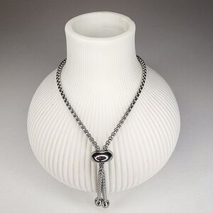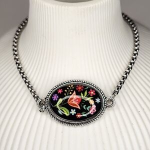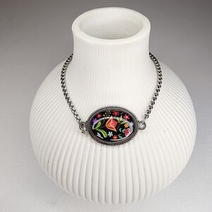 Bolo bracelet, adjustable bracelet, slider bracelet, box chain, medallion, charm bracelet, dangle, chain link, stainless steel jewelry, silver tone, Floral, flowery, handpainted, folk art, peasant style, Eastern European, Russian floral, enamel, cabachon, Cottagecore, Goblincore, bohemian, boho chic, whimsical, romantic, unique, statement piece, maximalist, eclectic, Black, colorful, vibrant, dark academia, polished finish, glossy.