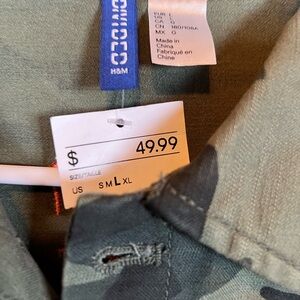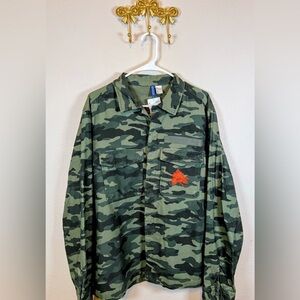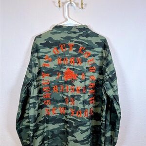 H&M camo button-up jacket. Olive green camouflage pattern. Small bright red stitched detail on front pocket and center of back. “Shout it out loud crew- raised in New York”. Classic shirt styling. Casual military-inspired look. 100% Cotton