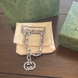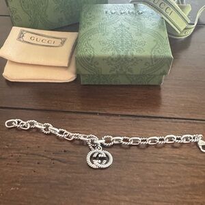 Gucci bracelet featuring twisted rope-style links. Dangling interlocking G charm. Lobster clasp closure. Polished silver-tone finish.