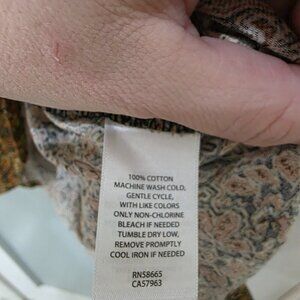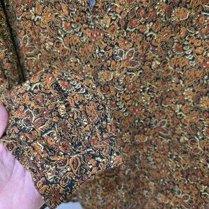 This Treasure & Bond paisley blouse blends vintage-inspired charm with modern comfort. Made from 100% cotton, it’s lightweight, breathable, and perfect for year-round wear. The rich brown, gold, and rust tones give it a warm boho feel, while the puff sleeves, collared neckline, and relaxed fit make it an effortless choice for workwear, weekend outfits, or a polished casual look.