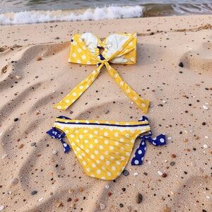 Charming yellow polka dot bikini with navy contrast ties. Strapless top with ties in the back this is not a halter