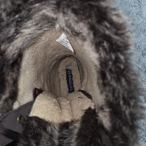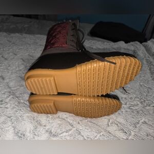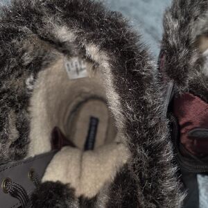 Faux-fur cuff and interior lined for added warmth. Lace-up front for adjustable fit. Waterproof lower shell shields from wet conditions. Rubber lug sole provides traction on slick surfaces.