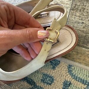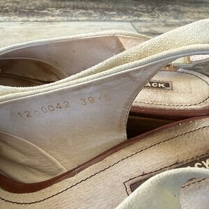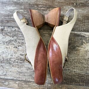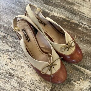 suede leather slingback shoes featuring an Italian design and a wooden heel. Derby style. Gently used and overall quite good condition. Adjustable buckle.