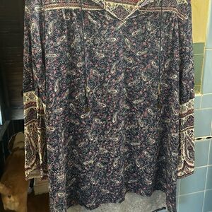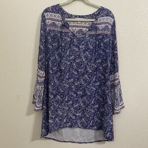 Billabong long-sleeve peasant tunic with all-over paisley print. Features a tie-neck and relaxed silhouette. Decorative patterned yoke and cuff details. Lightweight, flowy fabric for easy wear.