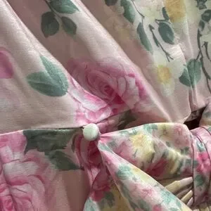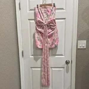Strapless mini dress with ruched skirt. Soft pink base with vibrant floral print. Fitted silhouette. Perfect for spring events or date night.