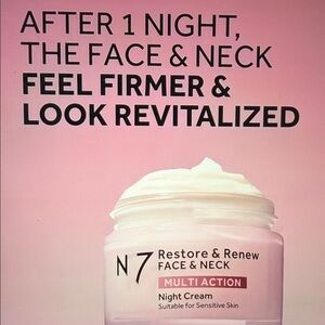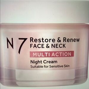 Restore & Renew Multi-Action Night Cream for face and neck. Hydrates and firms skin overnight while targeting signs of aging. Gentle formula suitable for sensitive skin. Packaged in a pink jar for a soft, feminine finish.