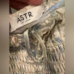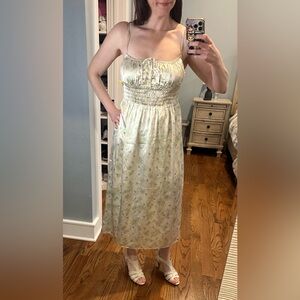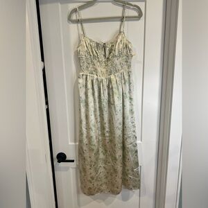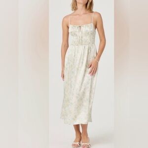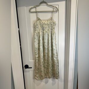 Light cream midi dress with a subtle floral print. Smocked bodice and thin adjustable straps. Flowing skirt for easy movement. Soft, lightweight fabric ideal for warm days. Fully lined.