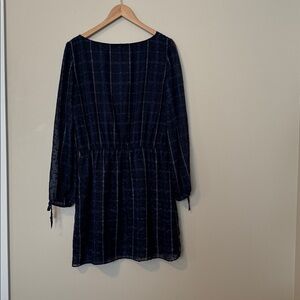 Tommy Hilfiger dress in navy with a subtle checked texture. Long sleeves with tie cuffs. Elasticized waist for a feminine fit. Lightweight, airy fabric for easy wear.