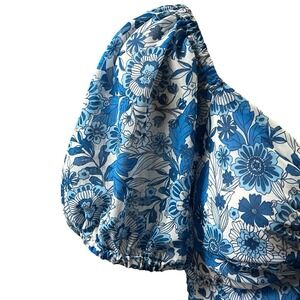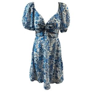 Sincerely Jules Dress Blue White Floral Puff Sleeve Twist Front Cottagecore Chic