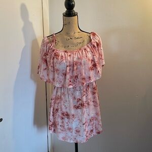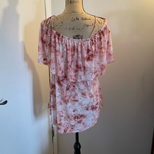 Off-shoulder blouse with a layered ruffle neckline. Soft pink tie-dye print for a relaxed, feminine vibe. Elastic neckline for easy wear. Lightweight flowy fabric for warm days.