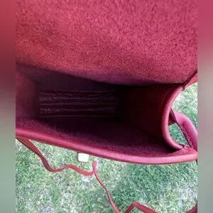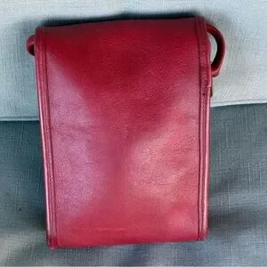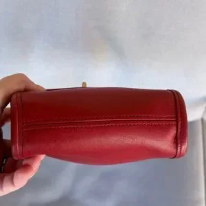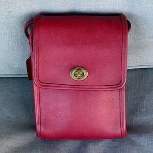 Compact red leather crossbody with a classic turnlock closure. Smooth leather exterior and strap for hands-free convenience. Clean, minimalist design perfect for daily use. Features gold-tone hardware that complements the red color. Great crossbody