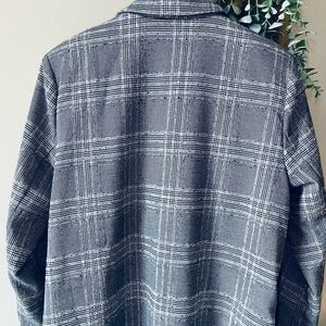 Elegant double-breasted trench with notch lapel. Gray plaid pattern for a timeless look. Long tailored silhouette that layers well. Button-front styling with classic pockets.