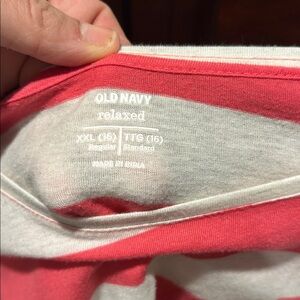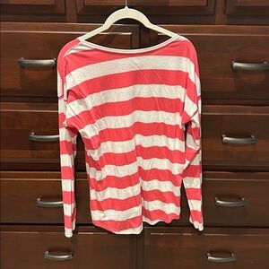 Relaxed fit long sleeve top. Wide coral and white horizontal stripes. Soft knit fabric. Easy, casual layering piece.