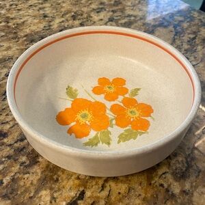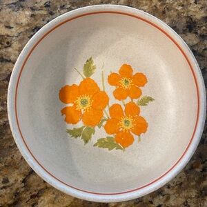 Lenox bowl featuring bold orange flowers with green leaves. Thin orange rim accent. Neutral cream background highlights the design. Great for a nostalgic bowl of cereal.