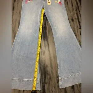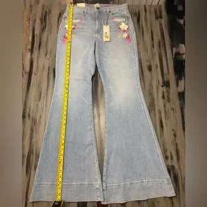 Channel a vintage 70s vibes with these iconic Alice + Olivia "Beautiful" jeans. These are the ultimate statement piece, featuring a dramatic bell-bottom silhouette and exquisite floral embroidery.