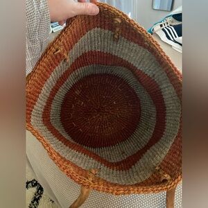 This is such a cute and handy sisal bag! Great leather straps and fun rust color and sage green stripes. A super great large size perfect for the beach or park days or the farmers market. One leather strap is damaged and makes it a bit weakened, but the bag still functions… you just can’t over stuff it without risking the strap breaking completely