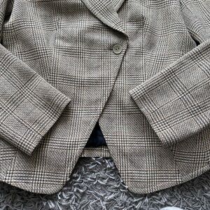 Elevate your professional wardrobe with this sophisticated tailored blazer by renowned Canadian designer Brian Bailey. Featuring a timeless micro-plaid pattern, this jacket is crafted from high-quality wool, offering both warmth and a sharp, structured silhouette. It’s a perfect piece for office wear, business meetings, or layering over a chic turtleneck.