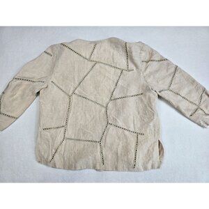 Embroidered Beige Linen Open Front Cardigan Jacket Geometric Cut-Out Detail M