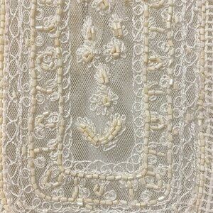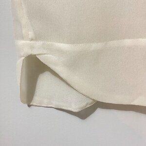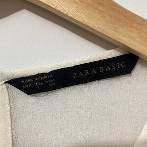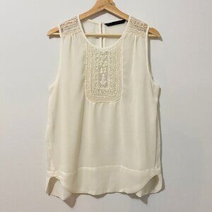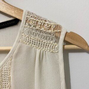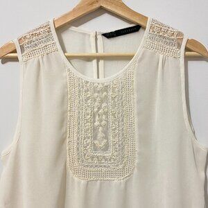 Zara tank top blouse. Lightweight satin fabric. Sheer ivory white. Detailed, dainty beadwork embroidery and openwork crochet knit on front and shoulders. Attached hem panel is rounded in front. Fabric is see-through but has two layers in the front. Relaxed, draping fit. Round neckline. Pleats at shoulders. Keyhole opening in back with button closure.